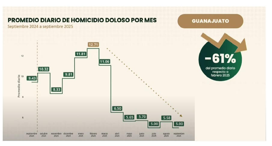 De acuerdo con las cifras oficiales, el estado pasó de registrar 9.4 homicidios diarios en septiembre de 2024 a 5 casos por día en septiembre de 2025, alcanzando su nivel más bajo en los últimos ocho años. Esta tendencia coloca a Guanajuato entre las entidades con mayor avance en la contención de la violencia letal, junto a Zacatecas, Chiapas, Quintana Roo, Jalisco y Nuevo León.