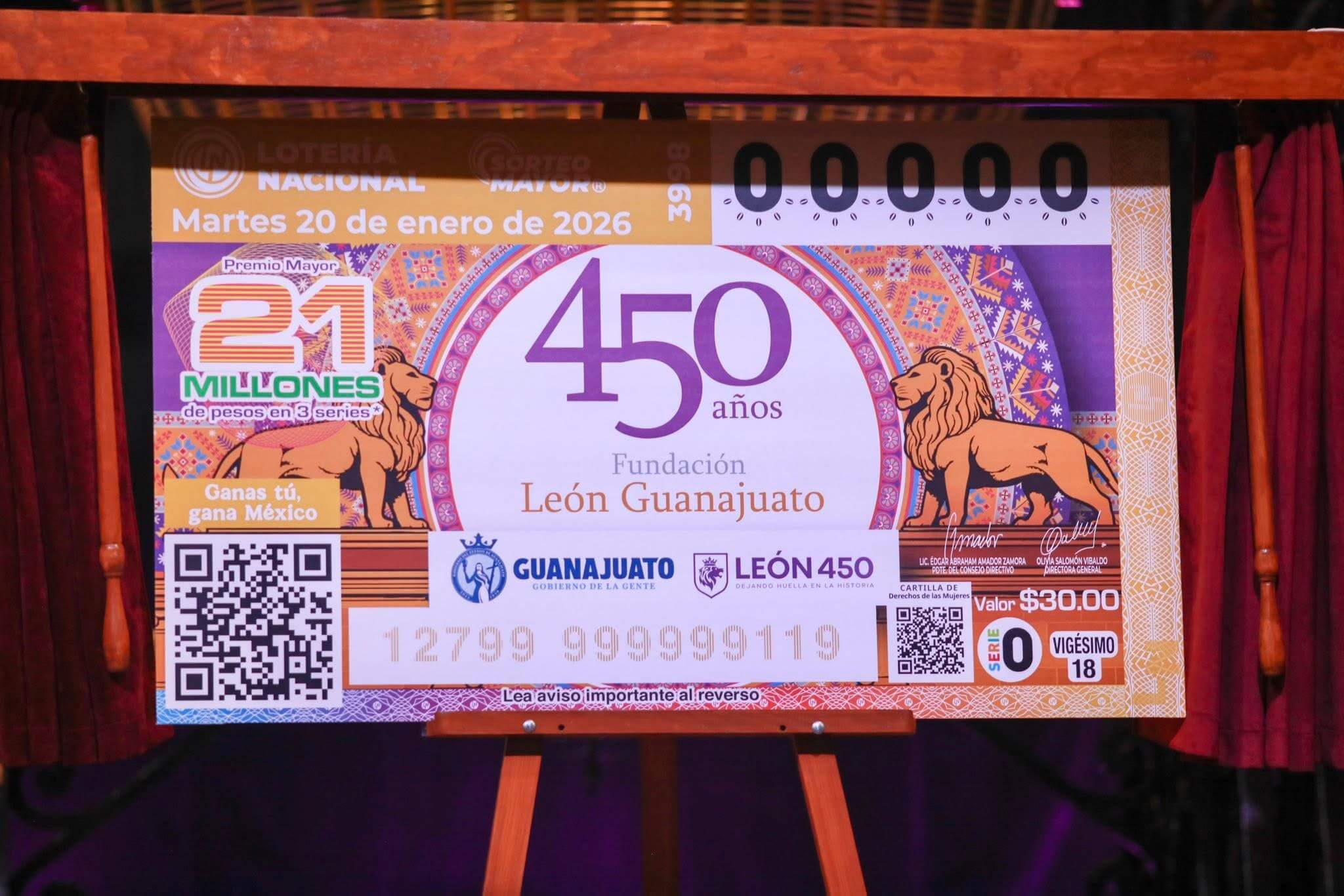 La develación del billete contó con la presencia de la gobernadora de Guanajuato, Libia Dennise García Muñoz Ledo; la presidenta municipal de León, Alejandra Gutiérrez Campos; y la directora general de la Lotería Nacional, Olivia Salomón, quienes coincidieron en destacar el valor simbólico de esta emisión especial.